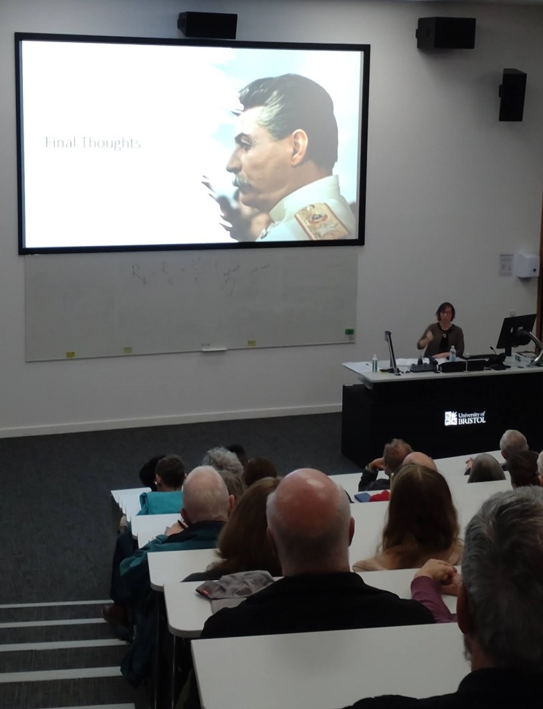 Dr Claire Knight gave a fascinating lecture on the how the personality cult around Stalin used cinema to promote Stalin as leader. Despite a few technical hiccups our massive audience of members, students and guests were entertained by film clips and extracts from letters to understand the impact these films made on Soviet citizens. Many Western film critics dismissed these films as meaningless corny propaganda. However, a study of them proved a real insight into how Soviet citizens attitudes to their leader changed over the decades. Claire began with the expensive technicolour film The Fall of Berlin, where Stalin features only in a cameo role.